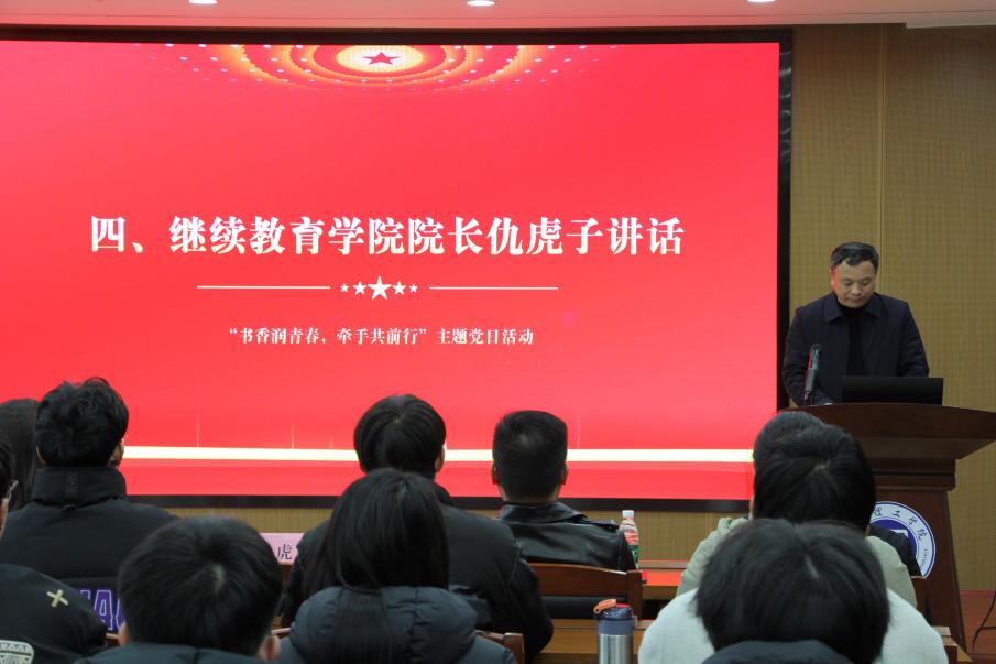 继续教育学院院长仇虎子进行讲话。他指出,此次“牵手”结对暨赠书仪式不仅是组织生活的创新,更是师生思想交融、薪火相传的生动实践。希望以此次活动为起点,进一步推动教育资源与工程实践资源深度融合,谋划开展更多形式丰富、内涵充实的共建活动,为培养担当民族复兴大任的时代新人贡献党建力量。