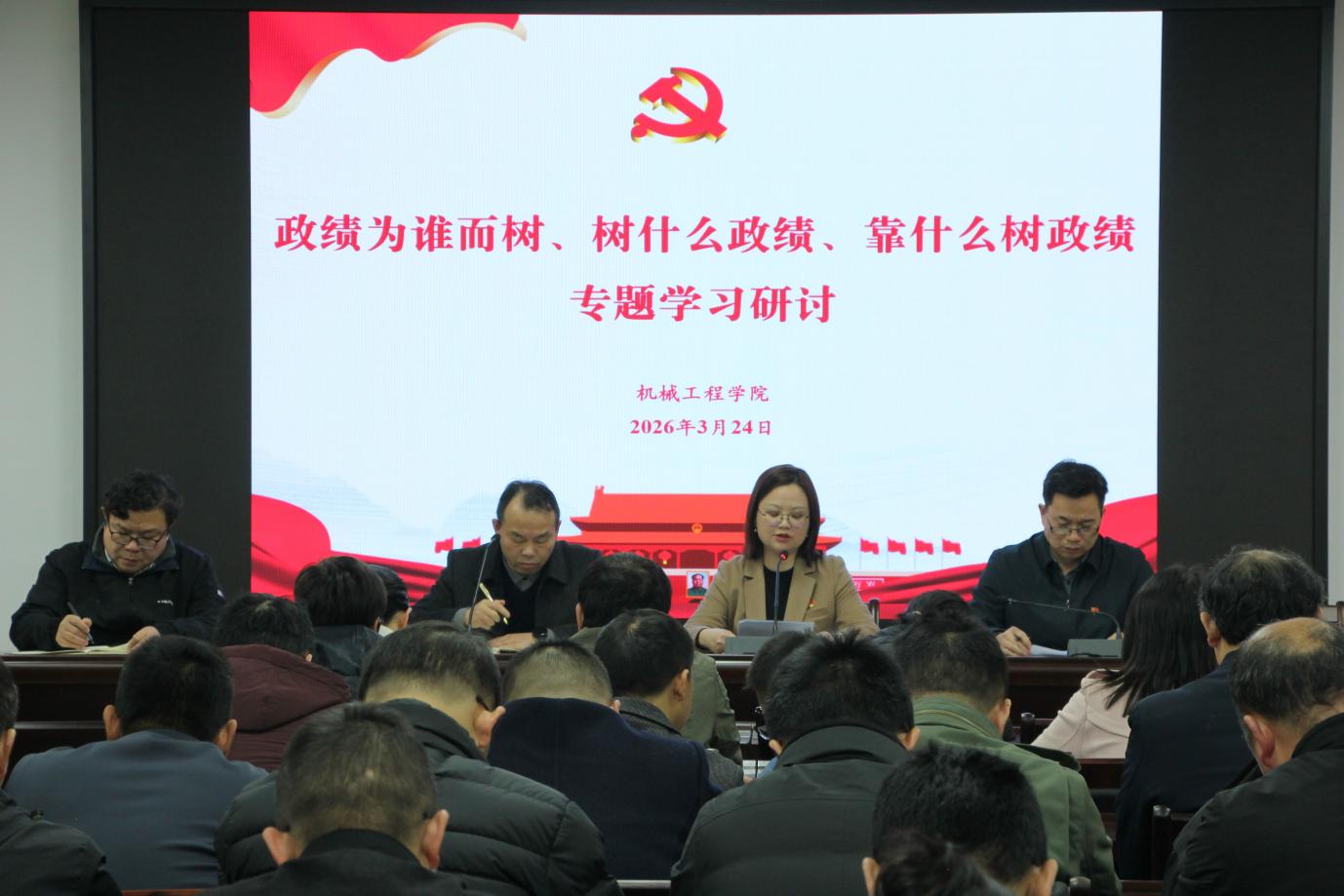 为深入贯彻树立和践行正确政绩观学习教育,切实把思想和行动统一到党中央决策部署上来,推动学院各项工作高质量发展,3月24日下午,学院在16302会议室召开“政绩为谁而树、树什么政绩、靠什么树政绩”专题学习研讨会,学院领导班子、全体教职工、学生党员代表参加会议。