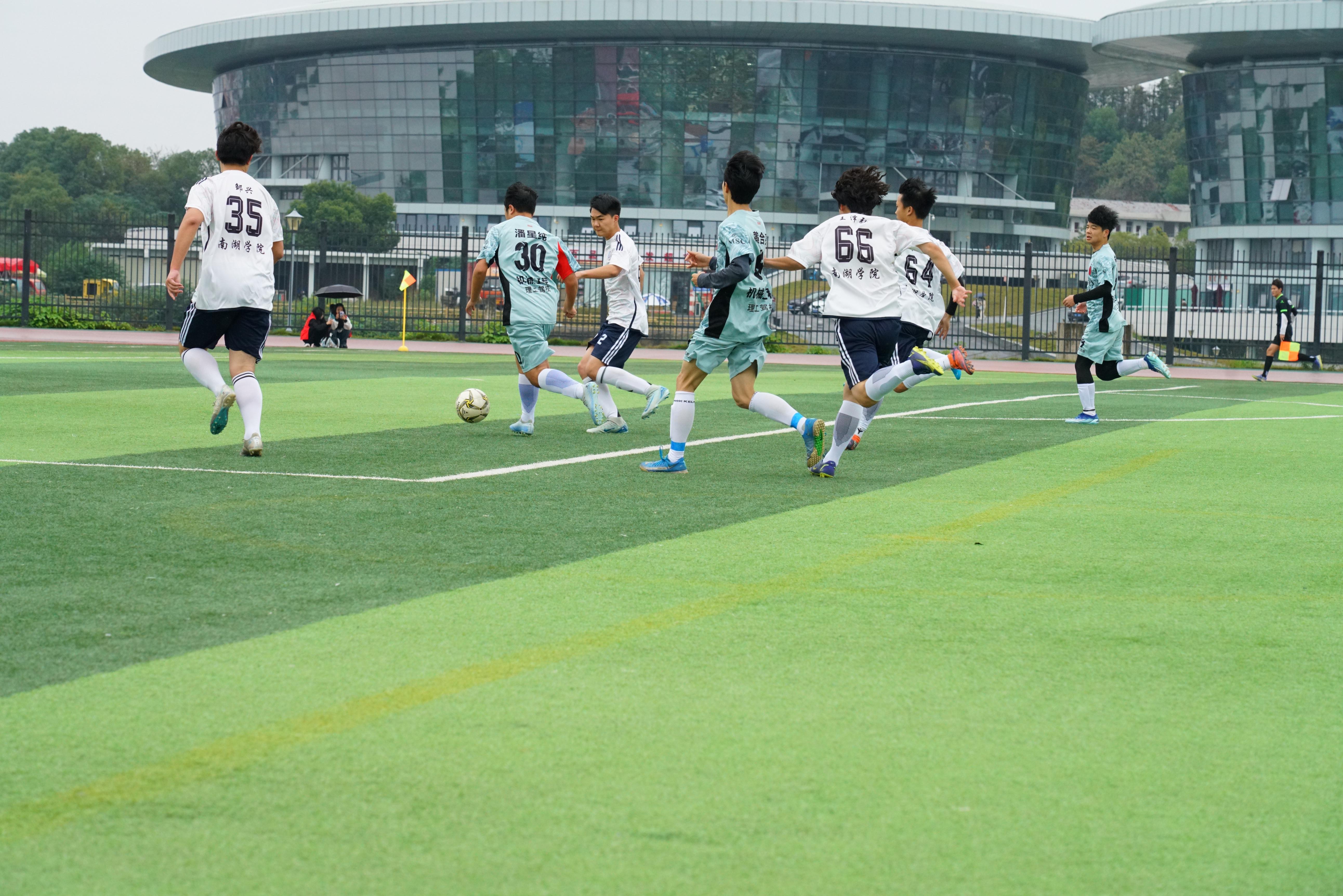 第13分钟,南湖学院抓住反击机会,迅速扳回一城,比分来到1:1平。此后,雨水加剧了场地湿滑,双方对抗愈发艰难,攻防转换间互有攻守却均未能突破对方防线,1:1的比分一直保持到60分钟。